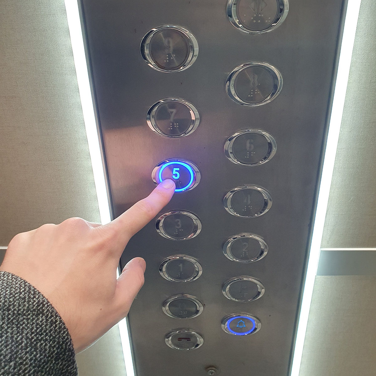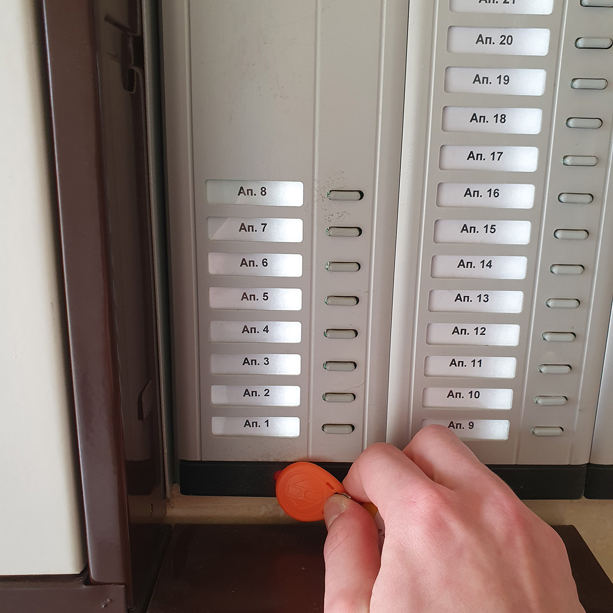 4. To enter the building, tap the chip on the bottom of the intercom, where the red dot is.